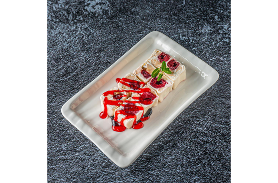 8 штук. Состав - Вишня, тесто харумаки, сыр сливочный, банан, сироп клубничный, сироп шоколадный.