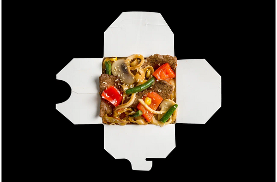 Говядина, перец болгарский красный, фасоль, кукуруза, омлет томаго, соус терияки, лапша удон, кунжут белый
