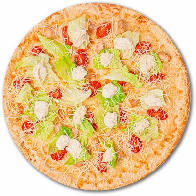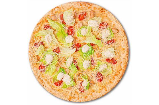 Состав: Цыплёнок, томаты черри, сыр пармезан, сыр моцарелла, соус сливочный чесночный, соус цезарь, салат айсберг, тесто.