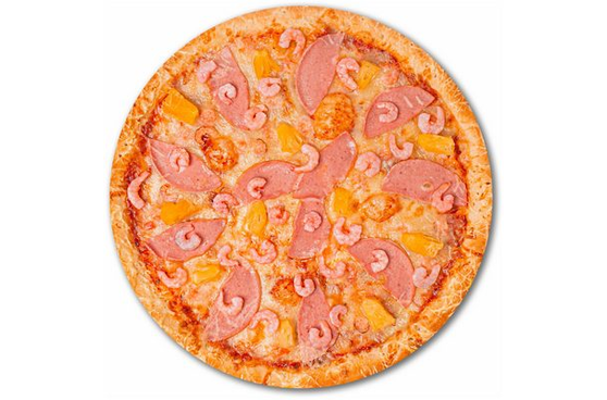 Состав: Креветки салатные, Ветчина, ананасы, сыр моцарелла, сыр пармезан, соус пицца, тесто.
