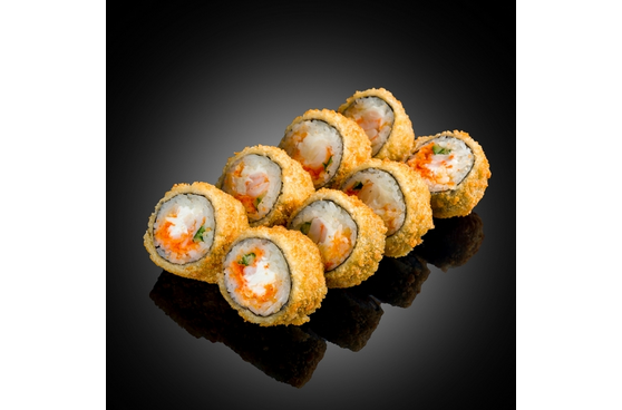 250 гр., Состав: креветки тигровые, икра масаго, сыр сливочный креметте, авокадо, сухари панировочная, смесь темпурная, рис, нори.