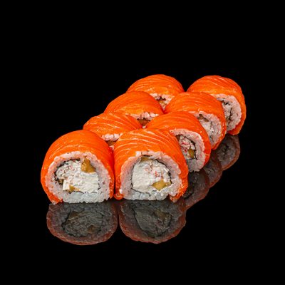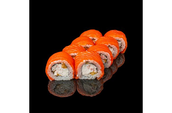 8 штук. Состав: Лосось свежий, манго, крабовый замес, сыр сливочный креметте, рис, нори.