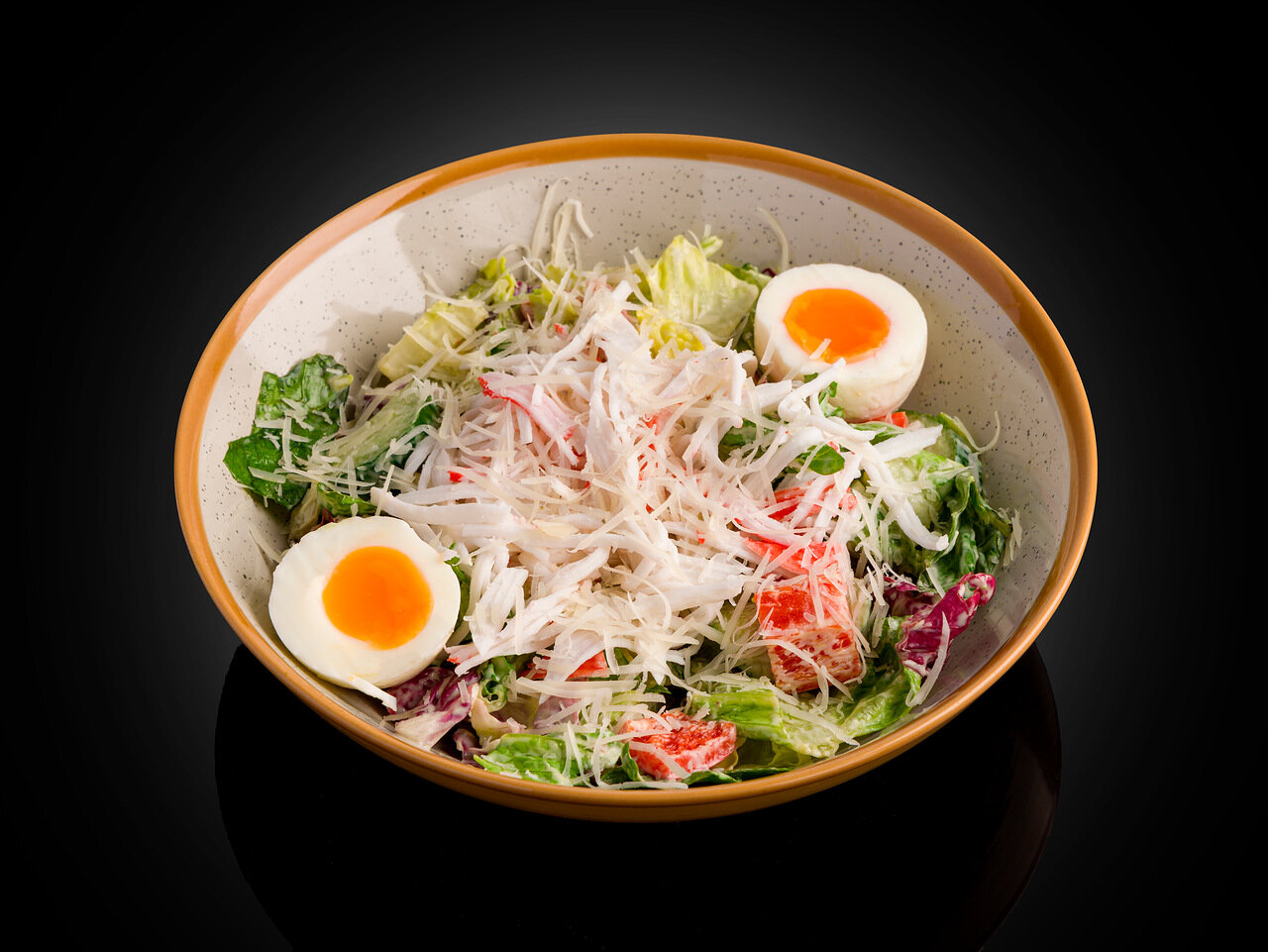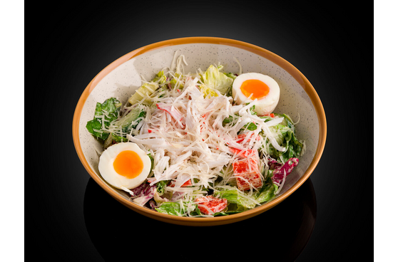 Микс салат, авокадо, томаты черри, паприка, яйцо, краб, огурцы, сыр пармезан, соус сметано васаби