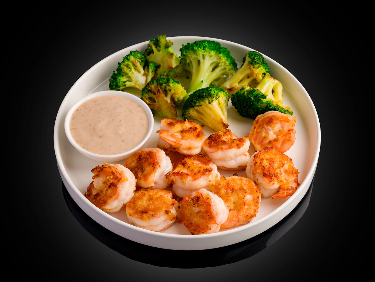 Эквадорские тигровые креветки, брокколи, сухари, ореховый соус