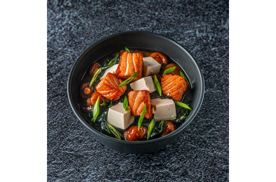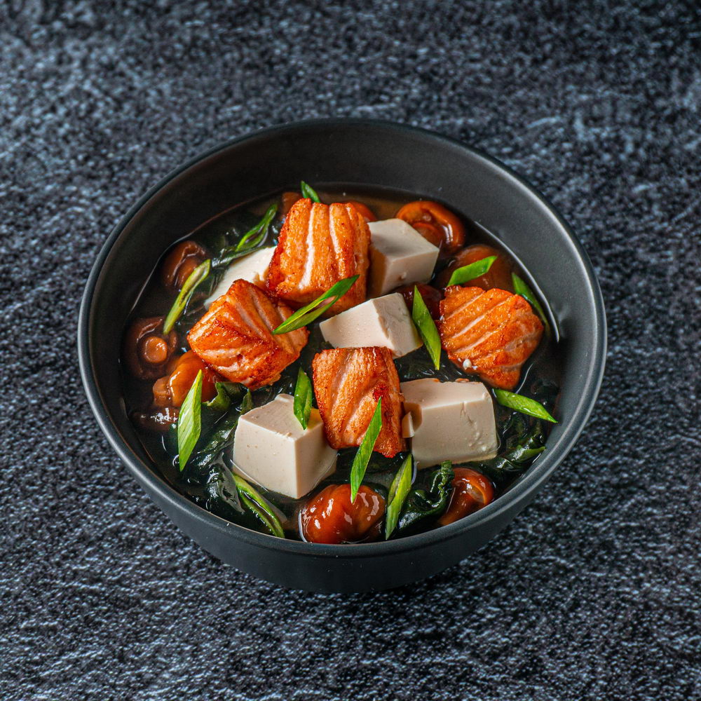 Состав - Лосось, бульон мисо, вакамэ, грибы намёко, сыр тофу, лук зелёный.