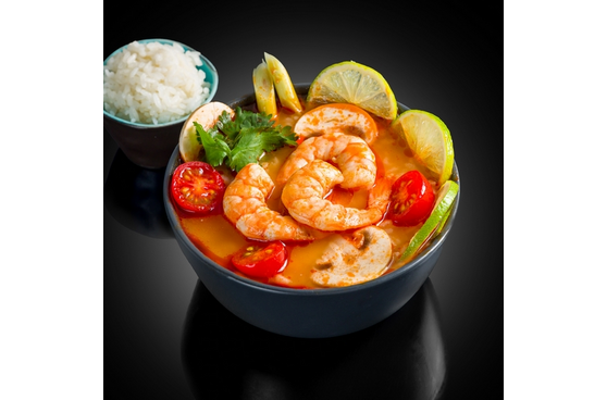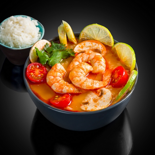 Состав: Креветки Тигровые, бульон том ям, кокосовое молоко, сливки, грибы шампиньоны, томаты Черри, кинза, рис.